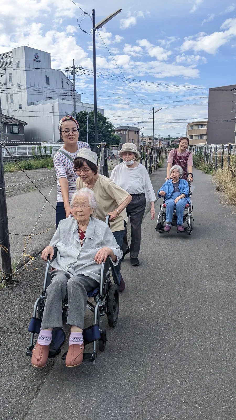 今回は、避難場所に指定されている高山小学校まで、避難経路を確認しながら実際に歩いてみました。杖や歩行器を使用されている方、車いすで移動される方もいらっしゃいましたが、皆さん落ち着いて安全に行動されていました。