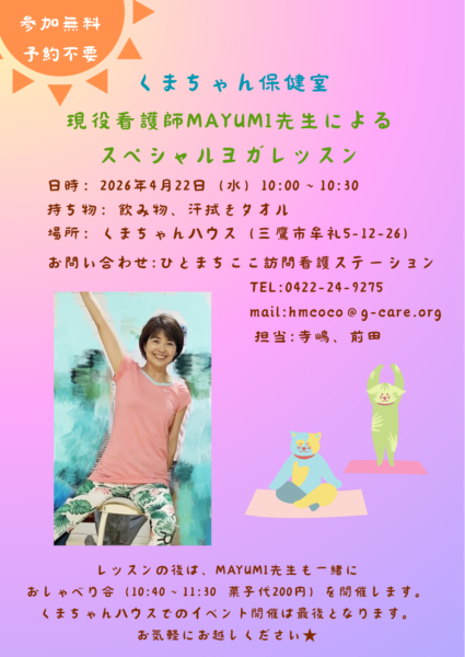 ひとまちここ訪問看護ステーションで毎週開催している地域の万事屋くまちゃん保健室ですが、4/22(水)は現役看護師MAYUMI先生がくまちゃんハウスにお越しくださり、対面にてヨガレッスンを行います。